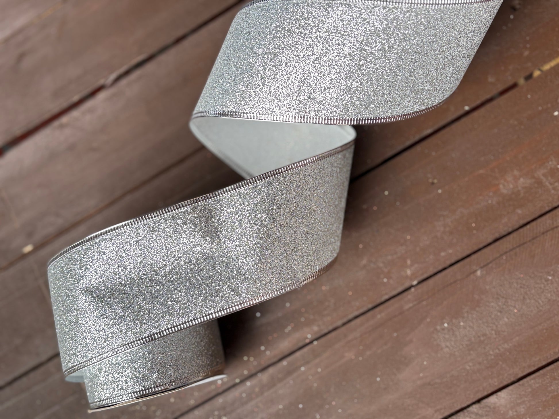 63mm GLITTERED SILVER FABRIC WIRED EDGE RIBBON x 10yrds
